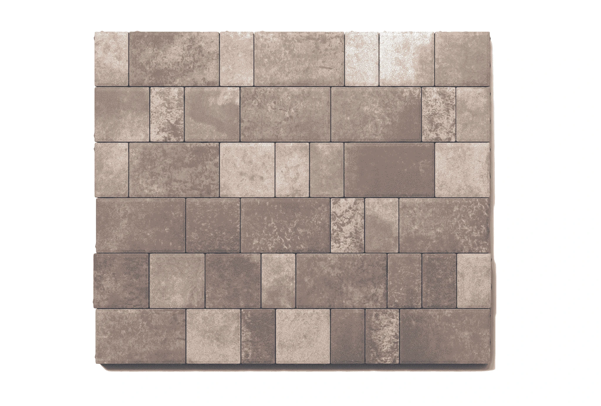 Состоит из 3-х элементов, которые выкладываются в хаотичном порядке рядами. Изготавливается по уникальной технологии методом полусухого вибропрессования из бетона. Поверхность бело-бежево-коричневого цвета.