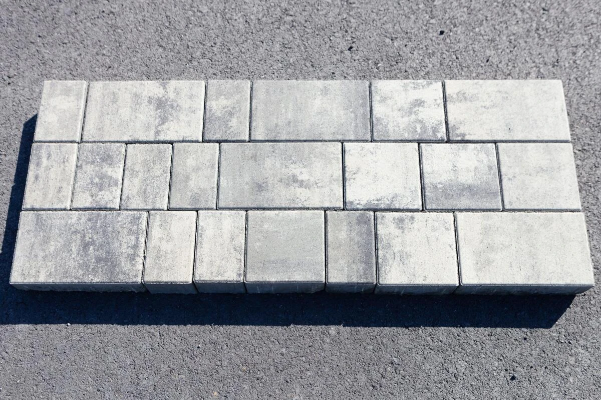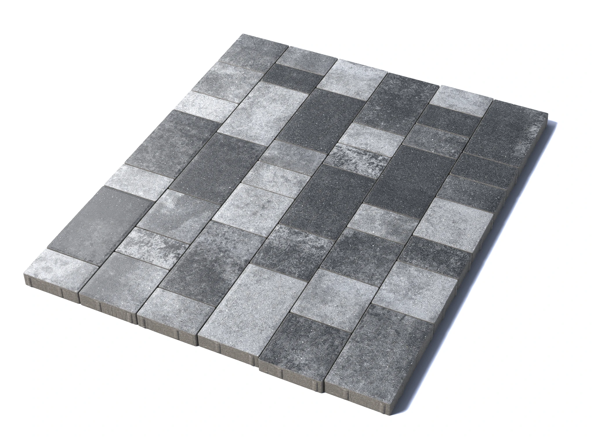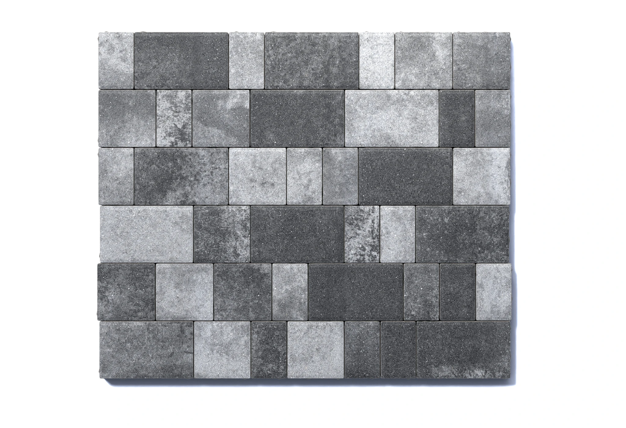 Состоит из 3-х элементов, которые выкладываются в хаотичном порядке рядами. Изготавливается по уникальной технологии методом полусухого вибропрессования из бетона. Поверхность черно-белого цвета.