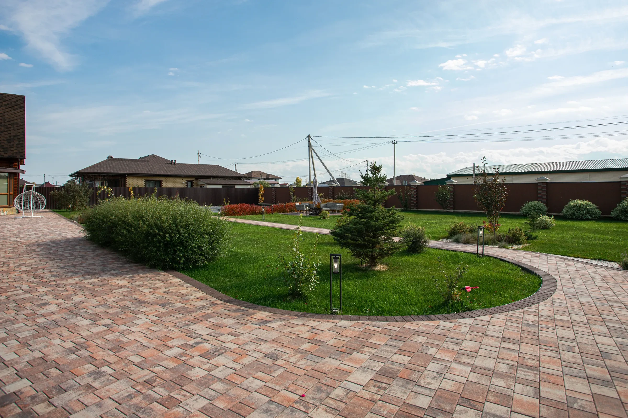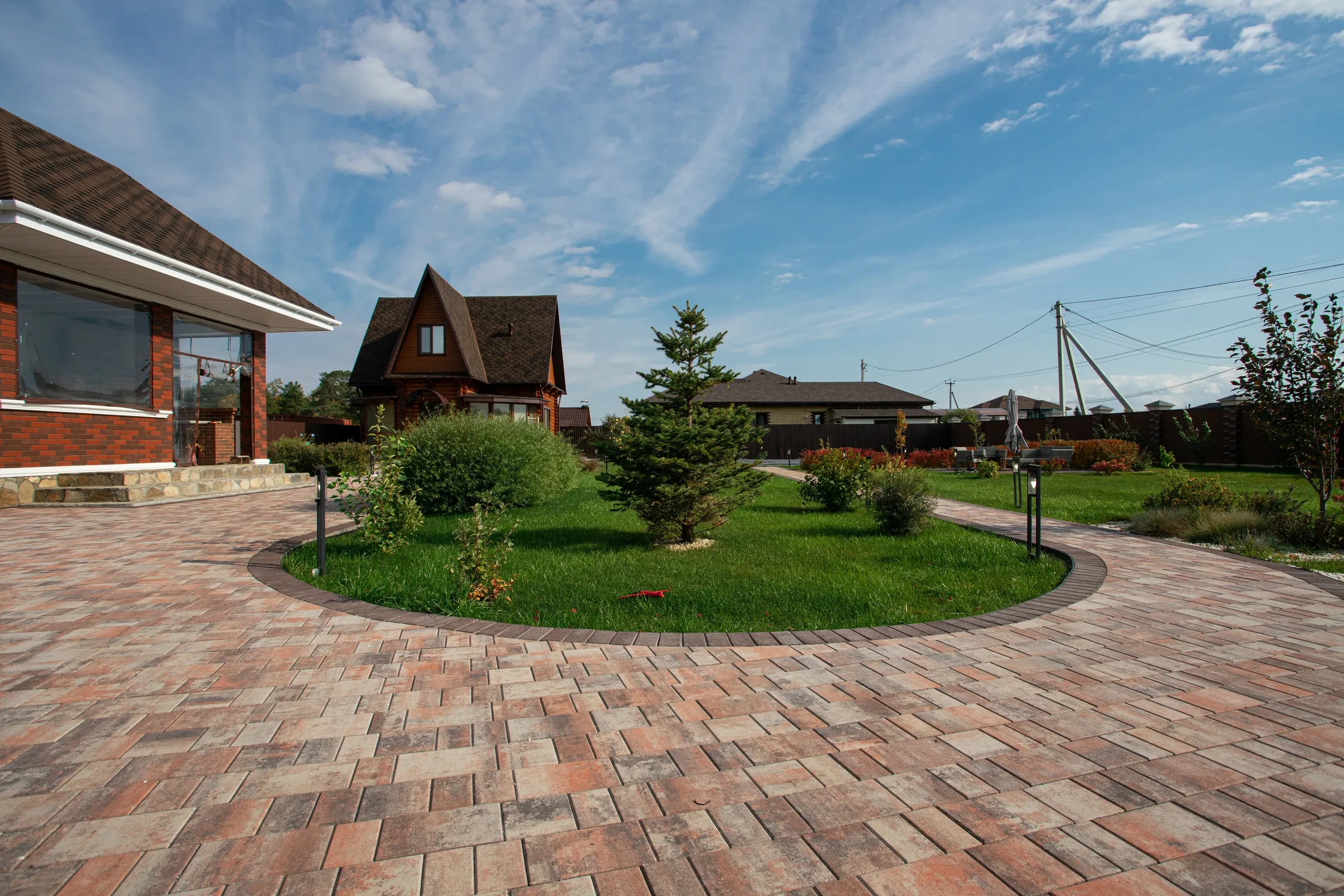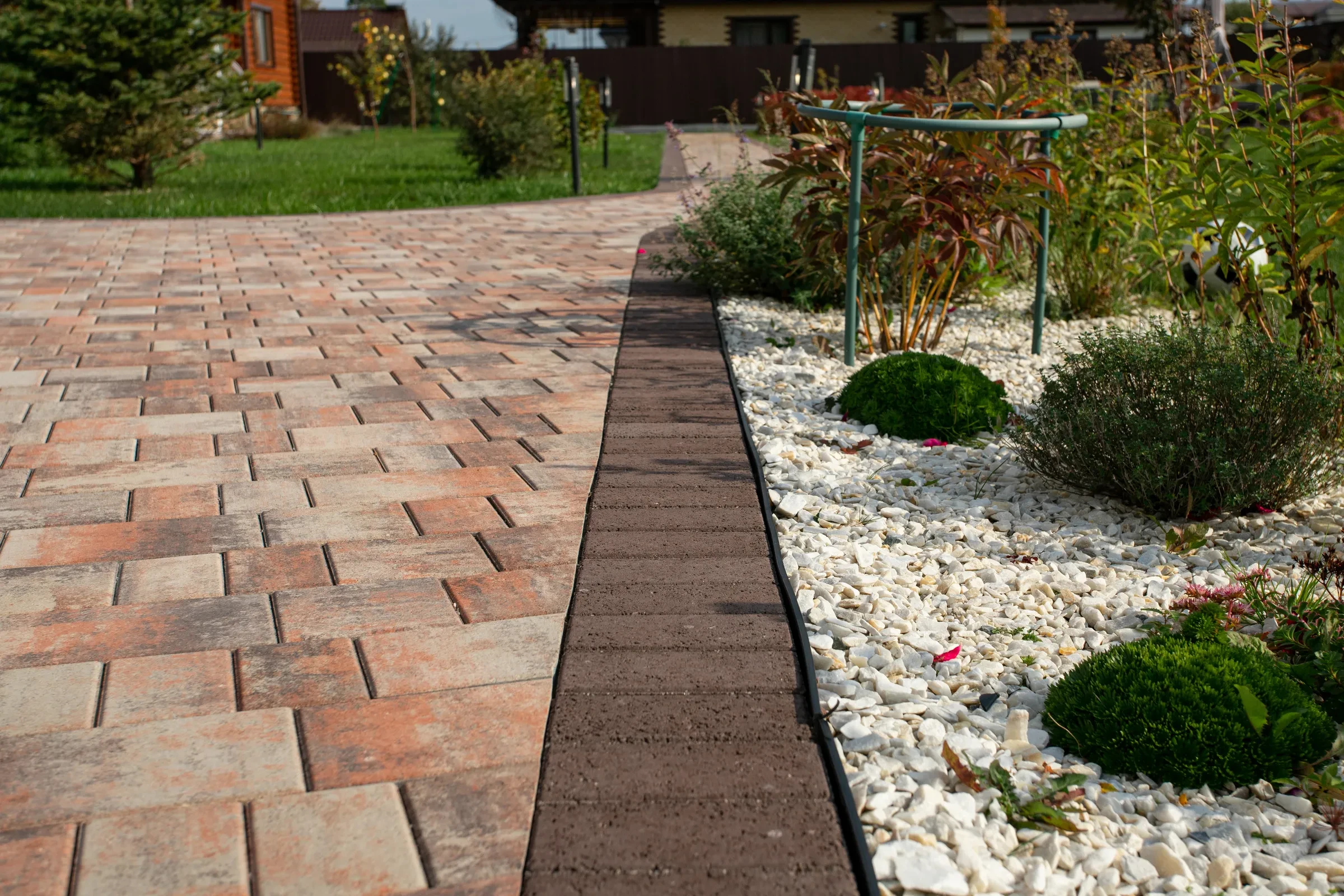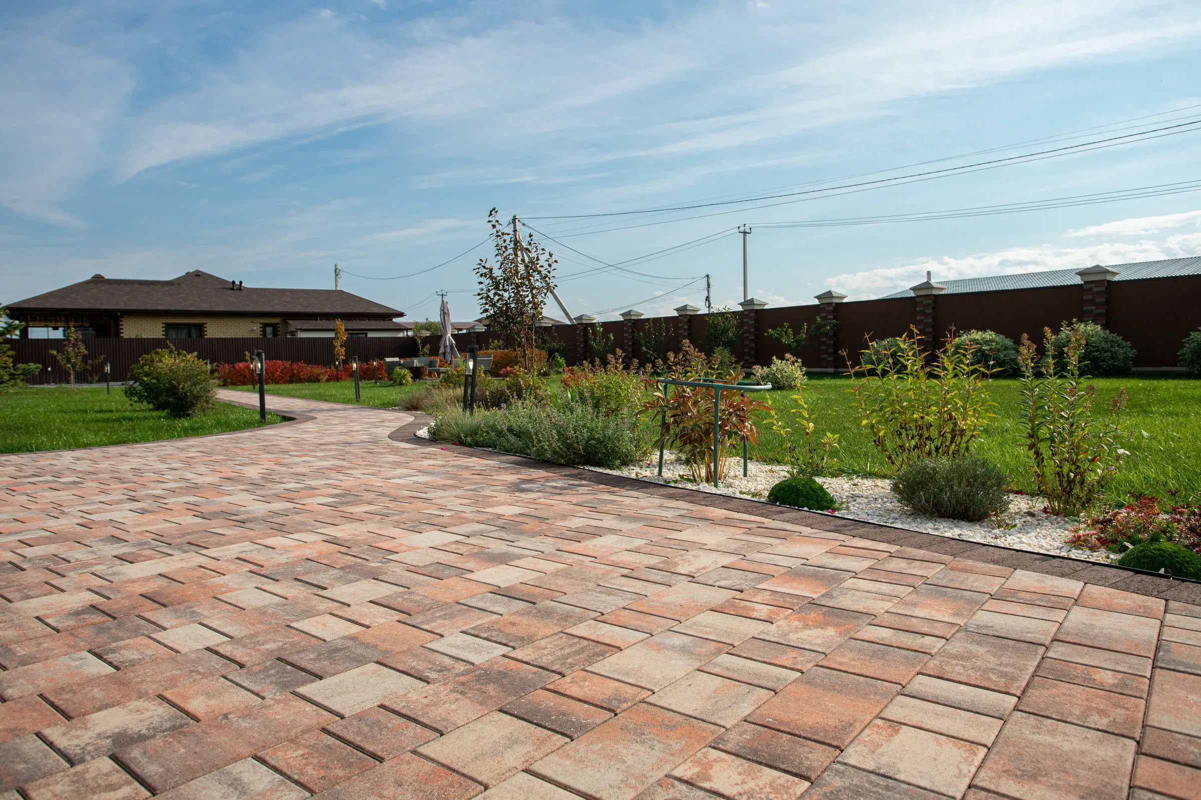 —Благоустройство участка под ключ с тротуарными дорожками цвета Клен