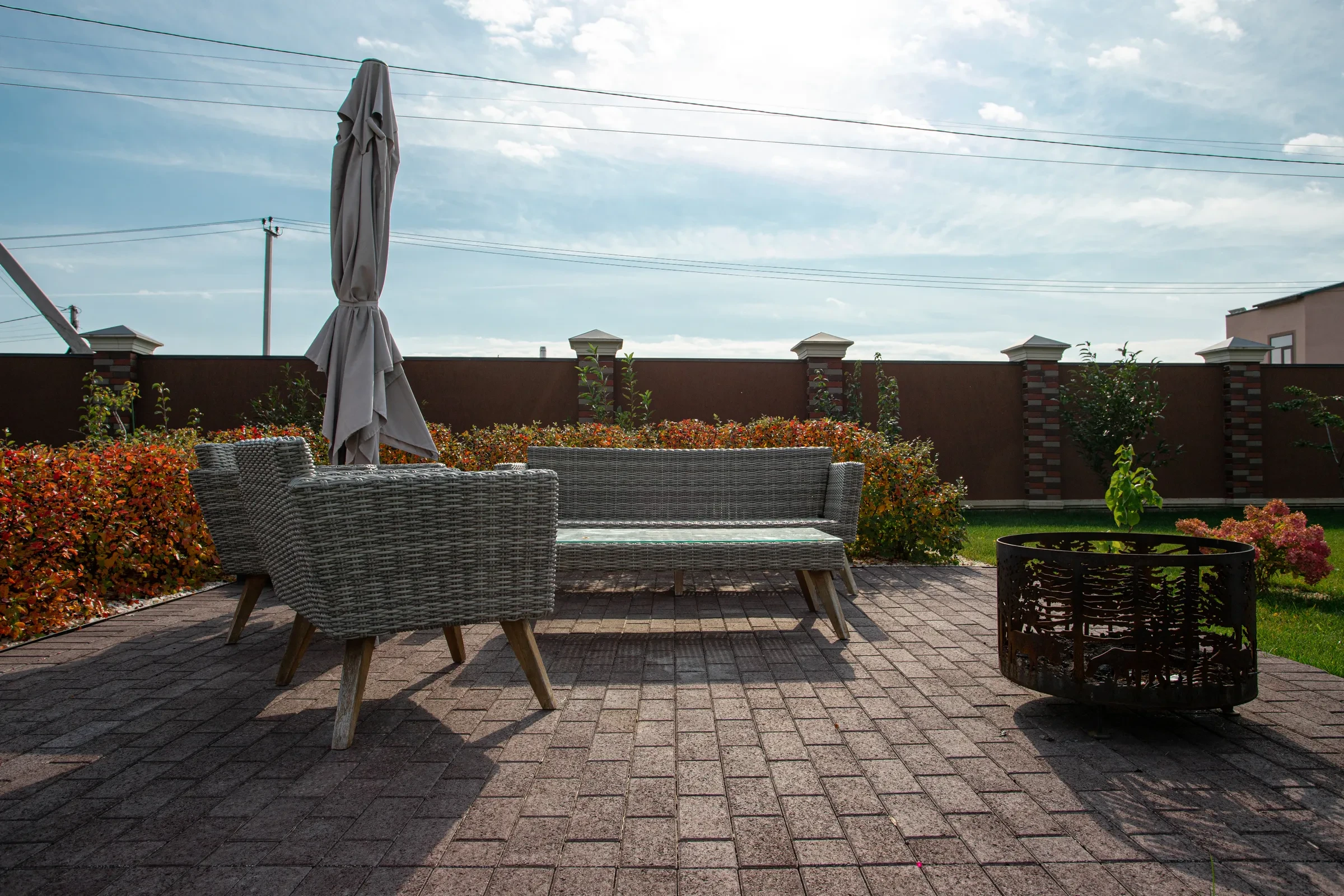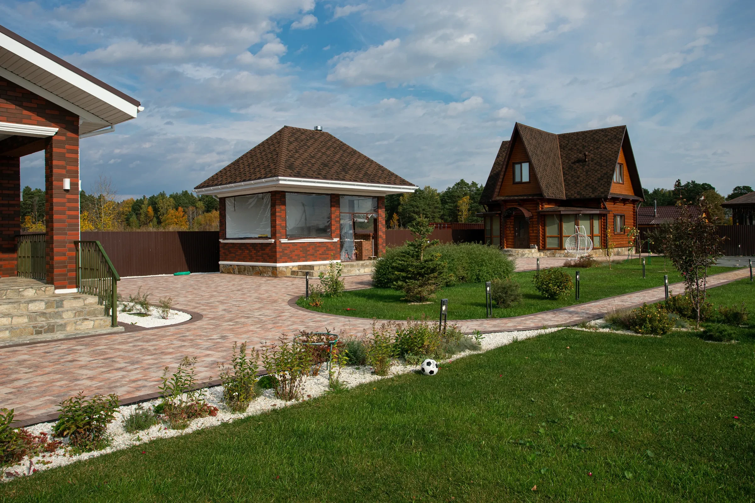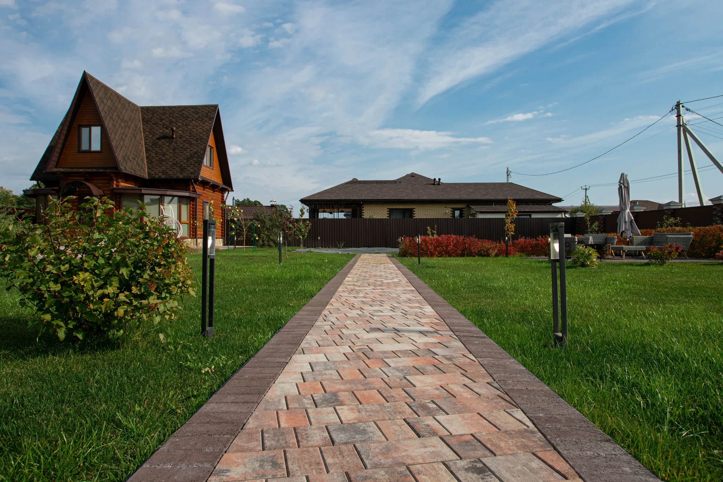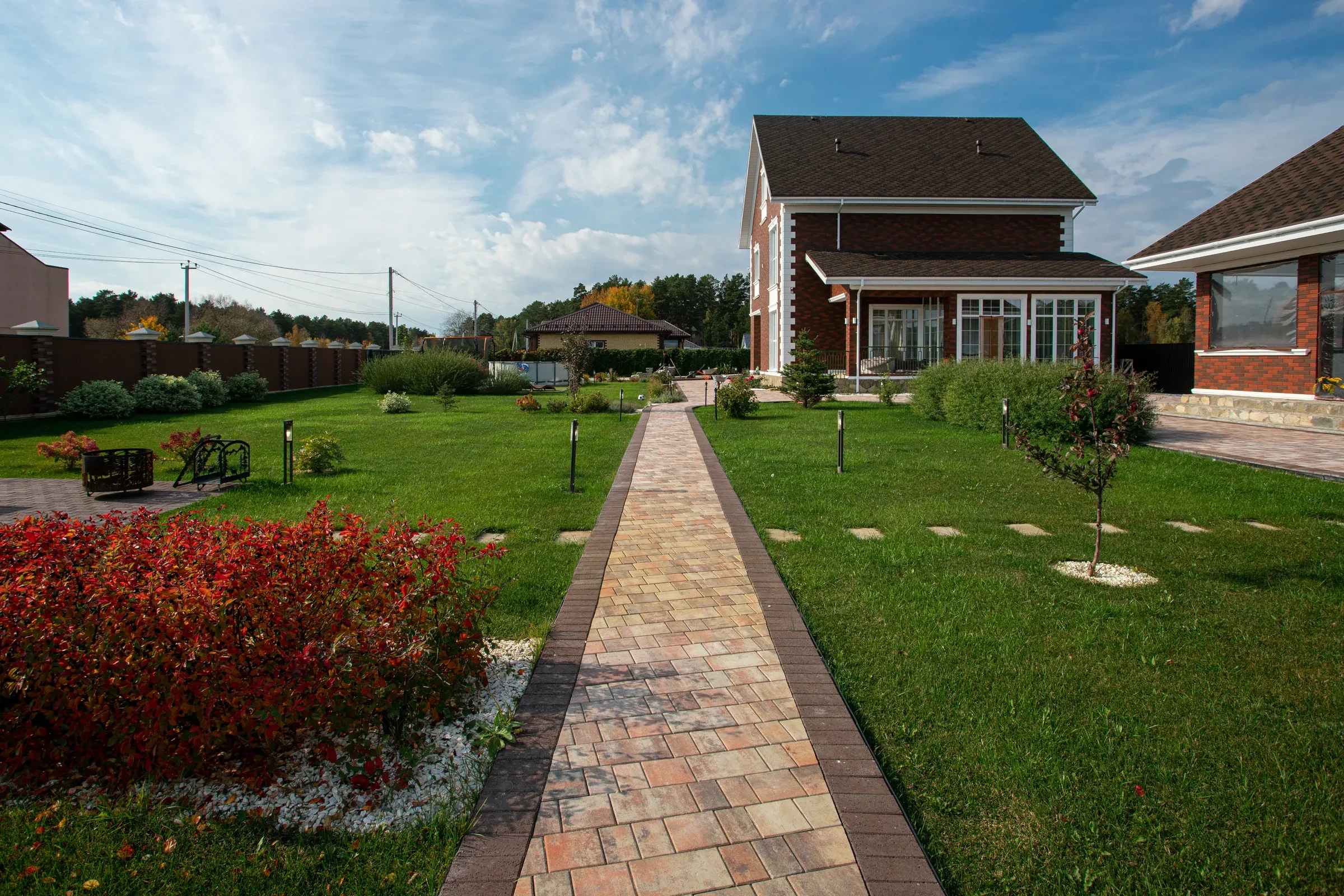 —Благоустройство участка под ключ с тротуарными дорожками цвета Клен