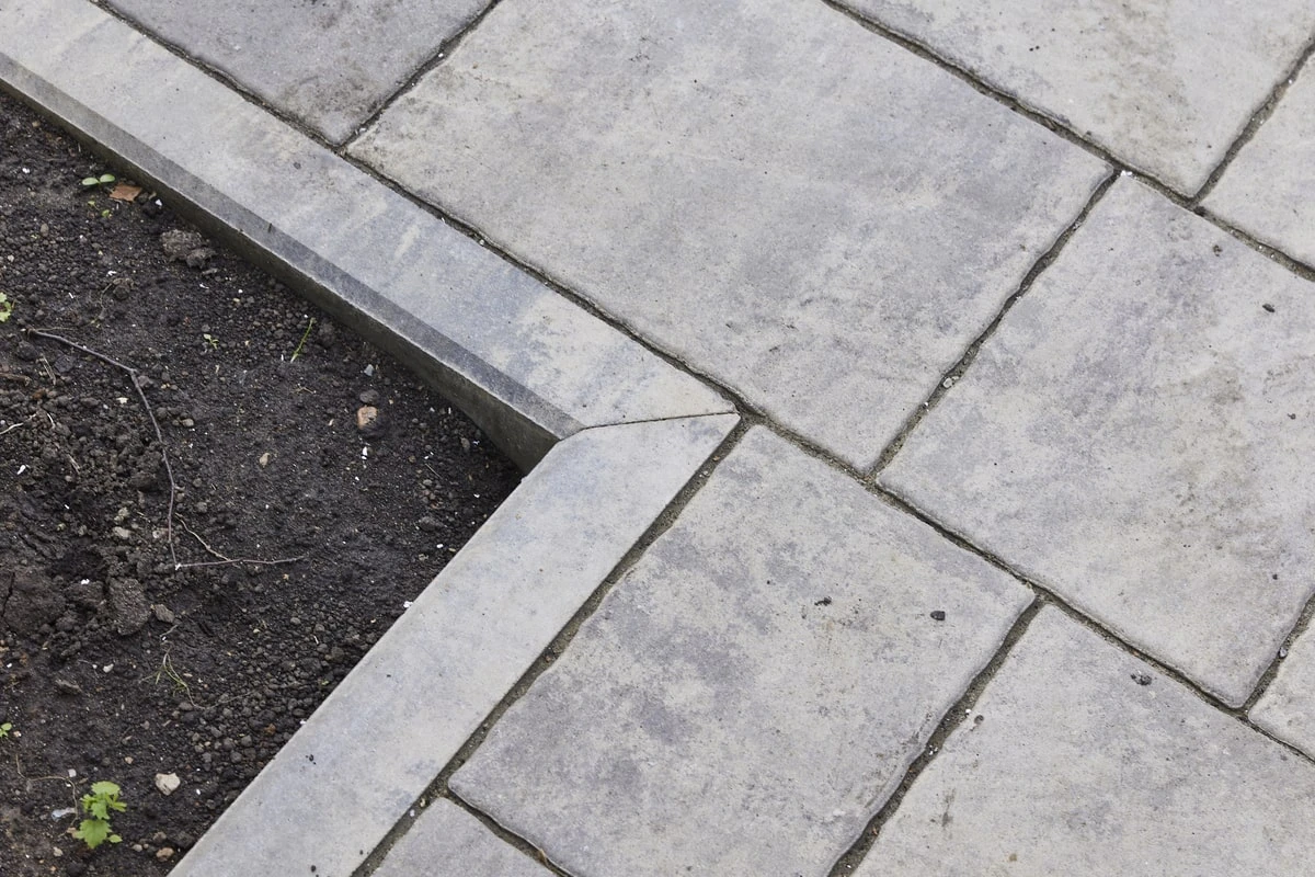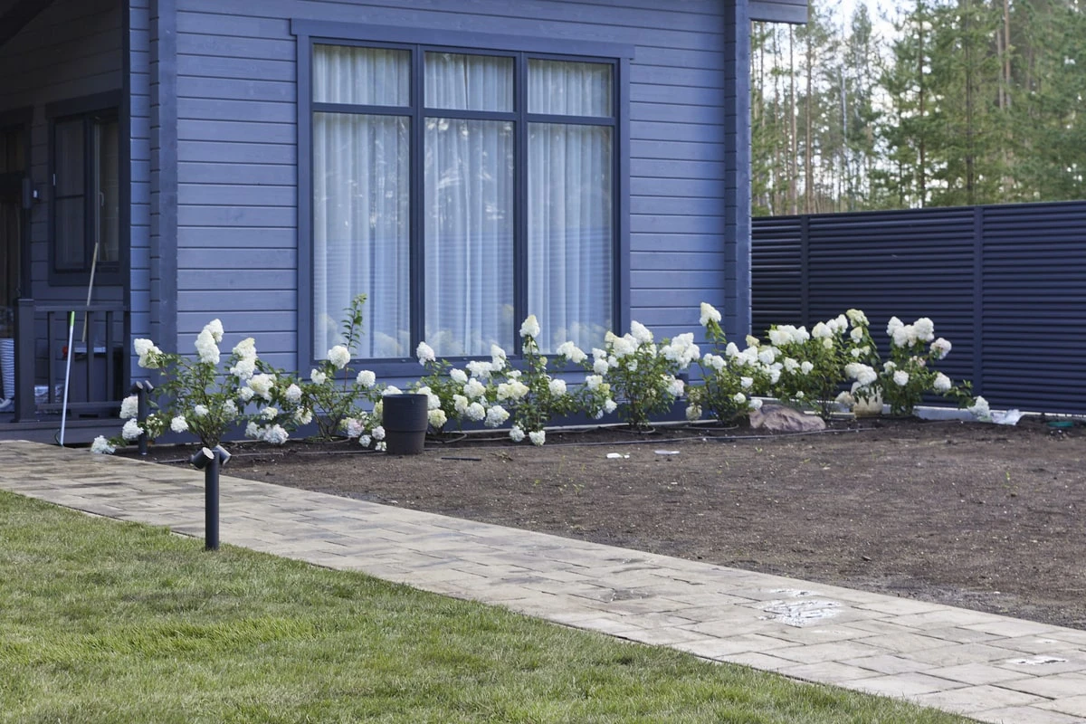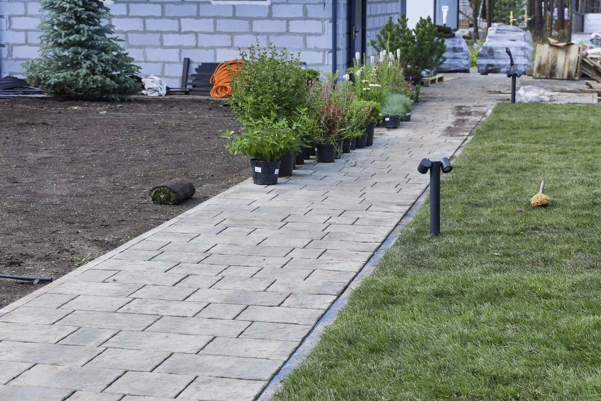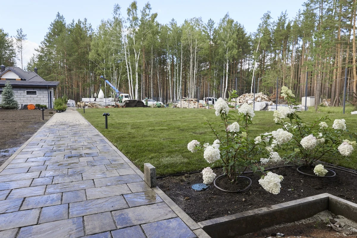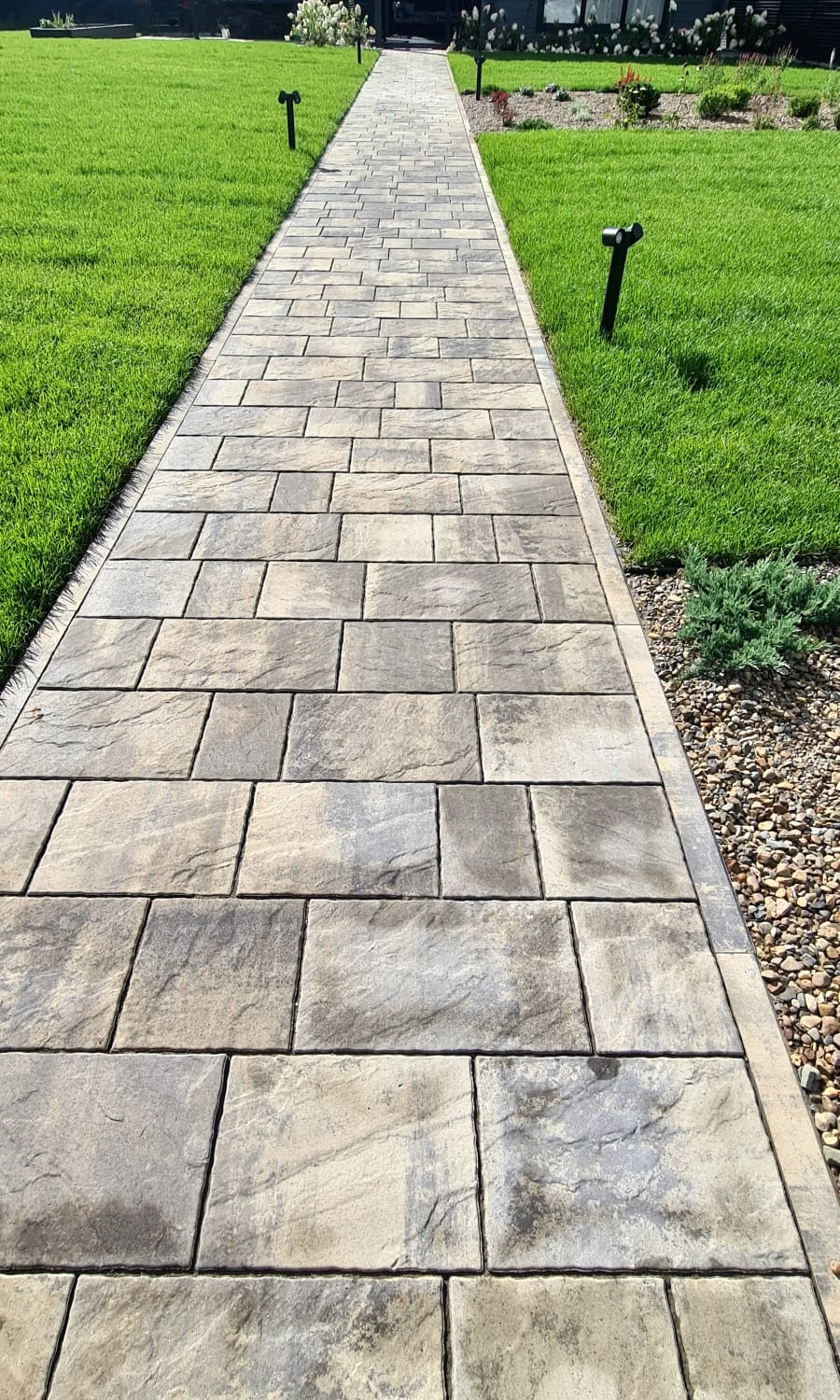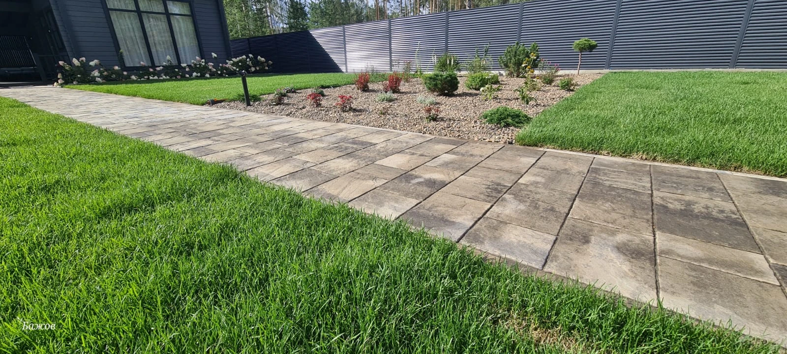 Для этих работ идеально подошли тротуарная плитка Литос в цвете Шунгит, а также бордюры в этом же цвете. Дорожки выполнены в строгом геометрическом формате с прямыми углами, ширина выбрана таким образом, чтобы как минимум два человека могли с легкостью идти рядом или разойтись на дорожке.