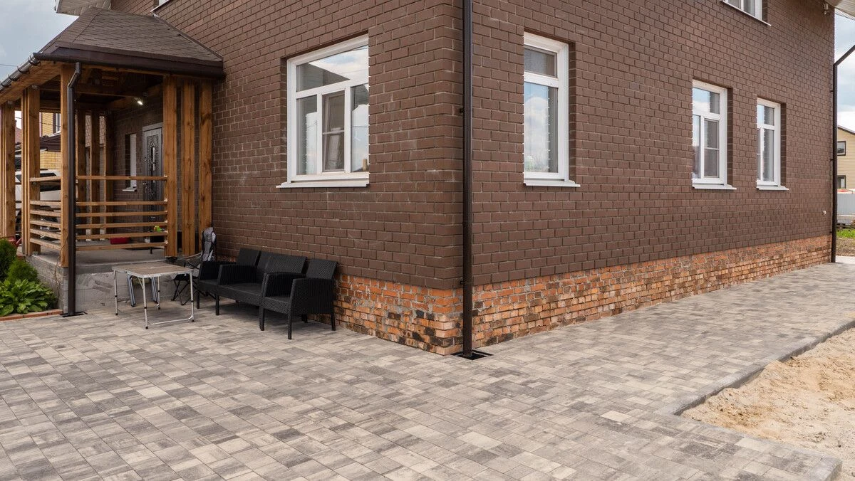 Для мощения отмостки дома, парковочной зоны перед гаражом и около входной зоны, понадобилось более 230 м2 тротуарной плитки формы Старый город в коллекции Гранит Листопад, цвете Антрацит. Данный цвет подразумевает под собой градиентный переход от белого к черному. А форма состоит из комплекта плит разного размера, который комбинируются при укладке между собой вразбежку.