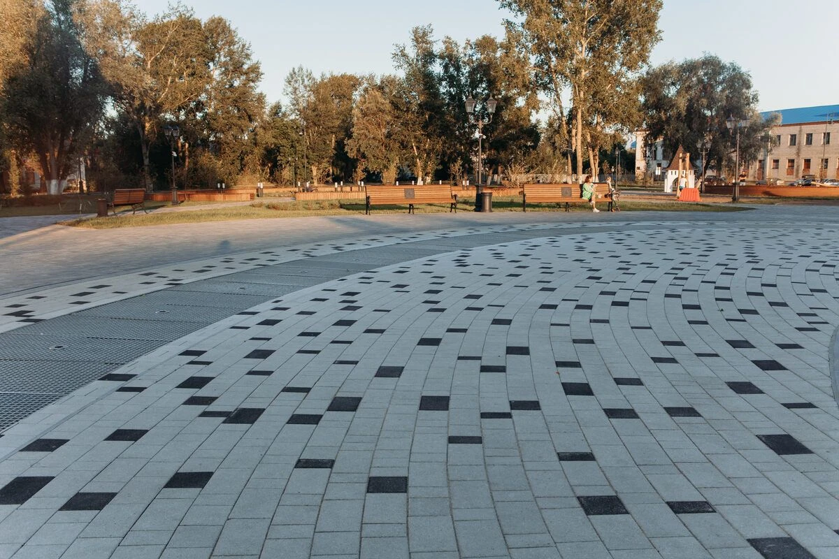 2. Благоустройство тротуарных дорожек: На всех пешеходных дорожках форма Старый город и Абрис. А в зоне фонтана плита Старый город, в фактуре Мрамор, белого и черного цвета.