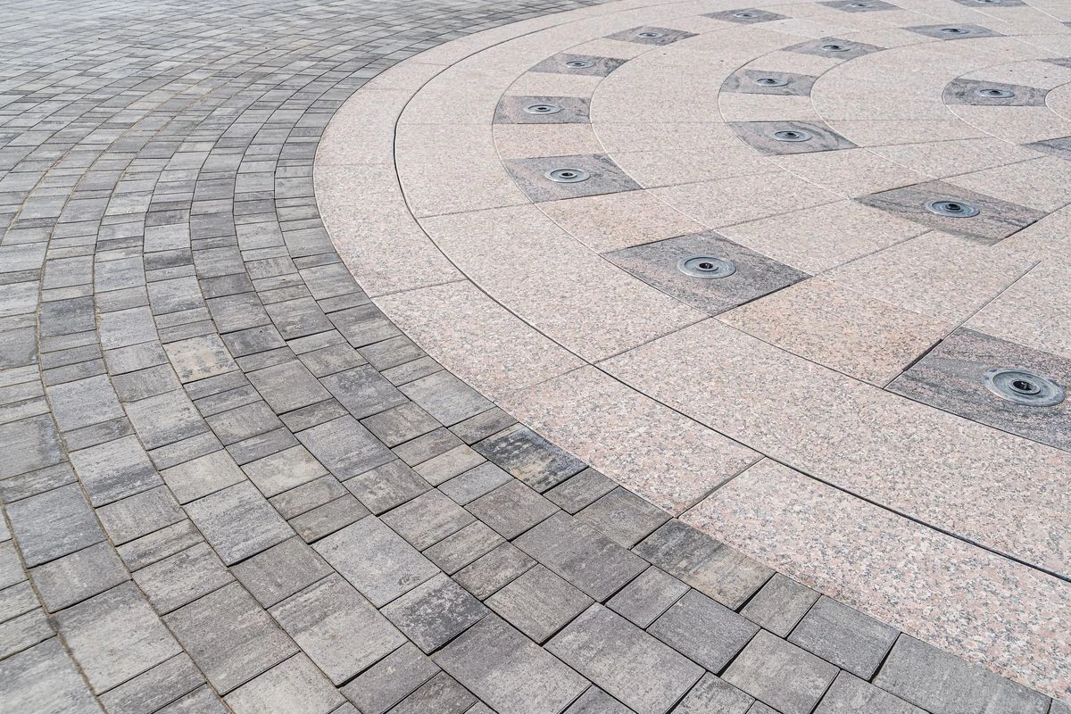 Зона фонтана и территория, где расположен памятник Маршалу И.Х. Баграмяну оформлены плиткой Старый город и прямоугольник 100 на 200 в цвете Антрацит.