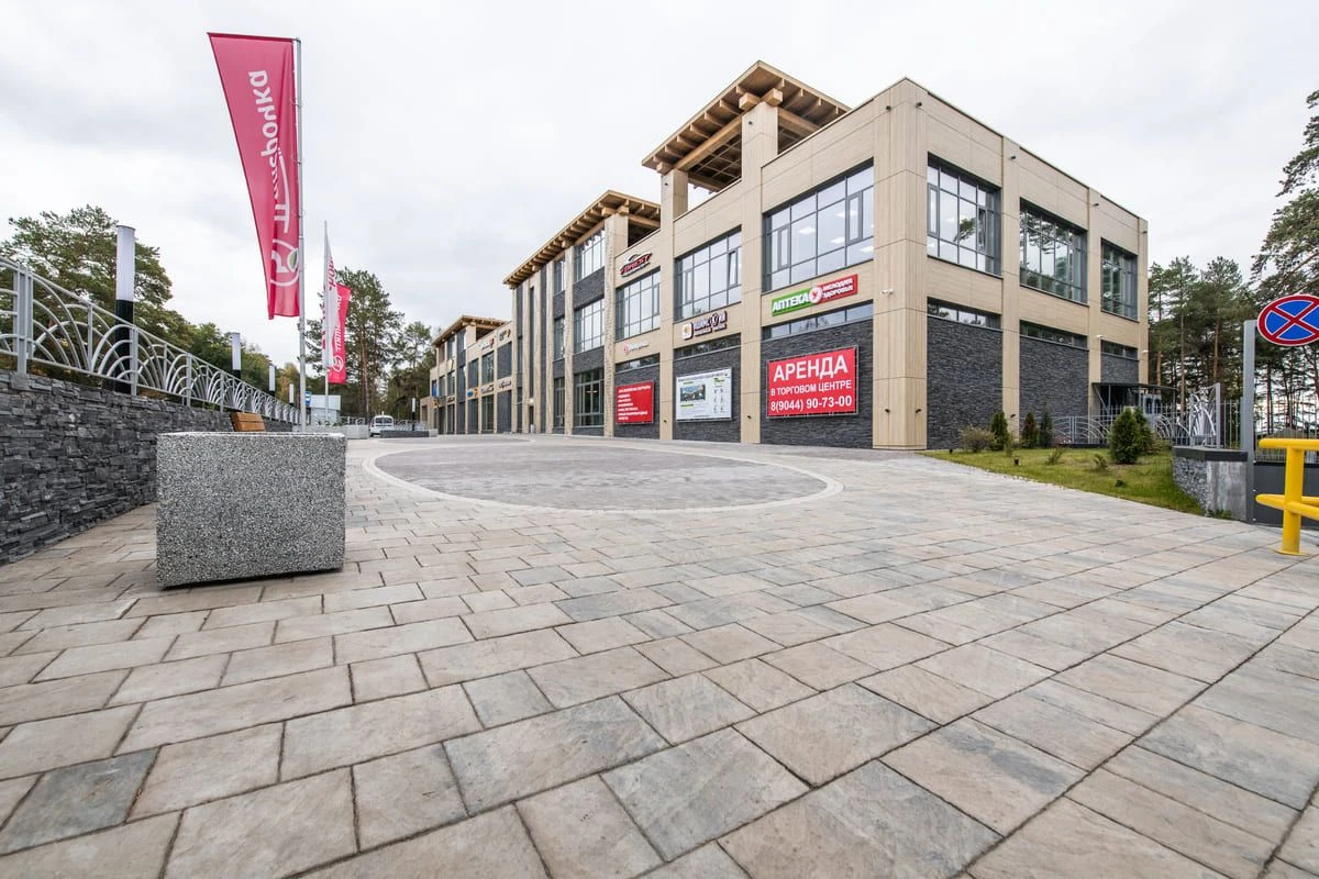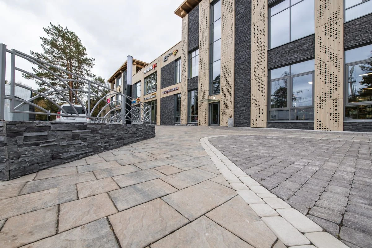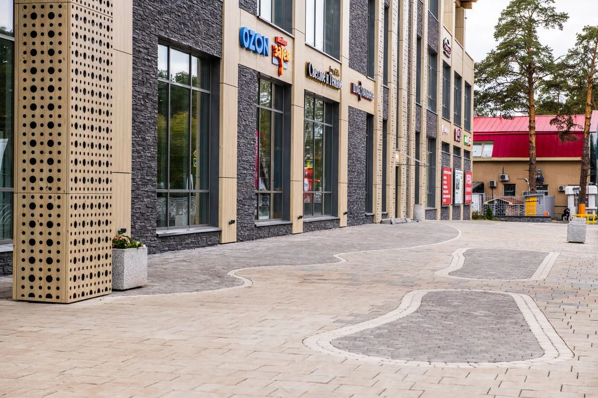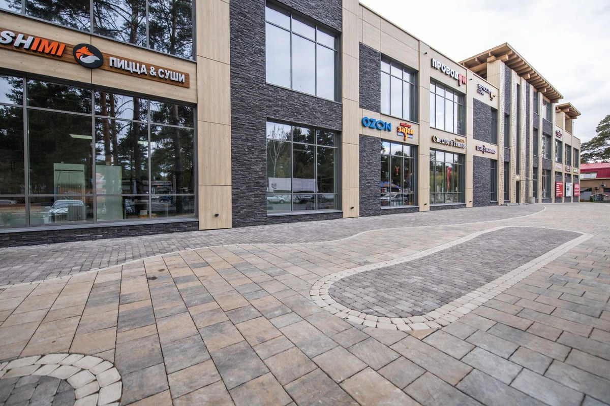 Торговый центр Верхний Бор находится на городской территории, потому особенно важно не только сохранить уникальный стиль здания, но и украсить его надежной и современной плиткой. Такой подход позволяет не только создавать узоры при мощении, но и обеспечивать долгий срок службы за счет качественных материалов и укладки плитки по технологии. С помощью комбинирования различных форм плитки — малого формата и крупного, а также сочетания различных цветов, можно формировать пространство. В результате получилось сделать уникальный узор, привлекающий внимание и дополняющий фасад здания. Для реализации проекта была выбрана тротуарная плита в толщине 60 мм, этого достаточно для пешеходных нагрузок.