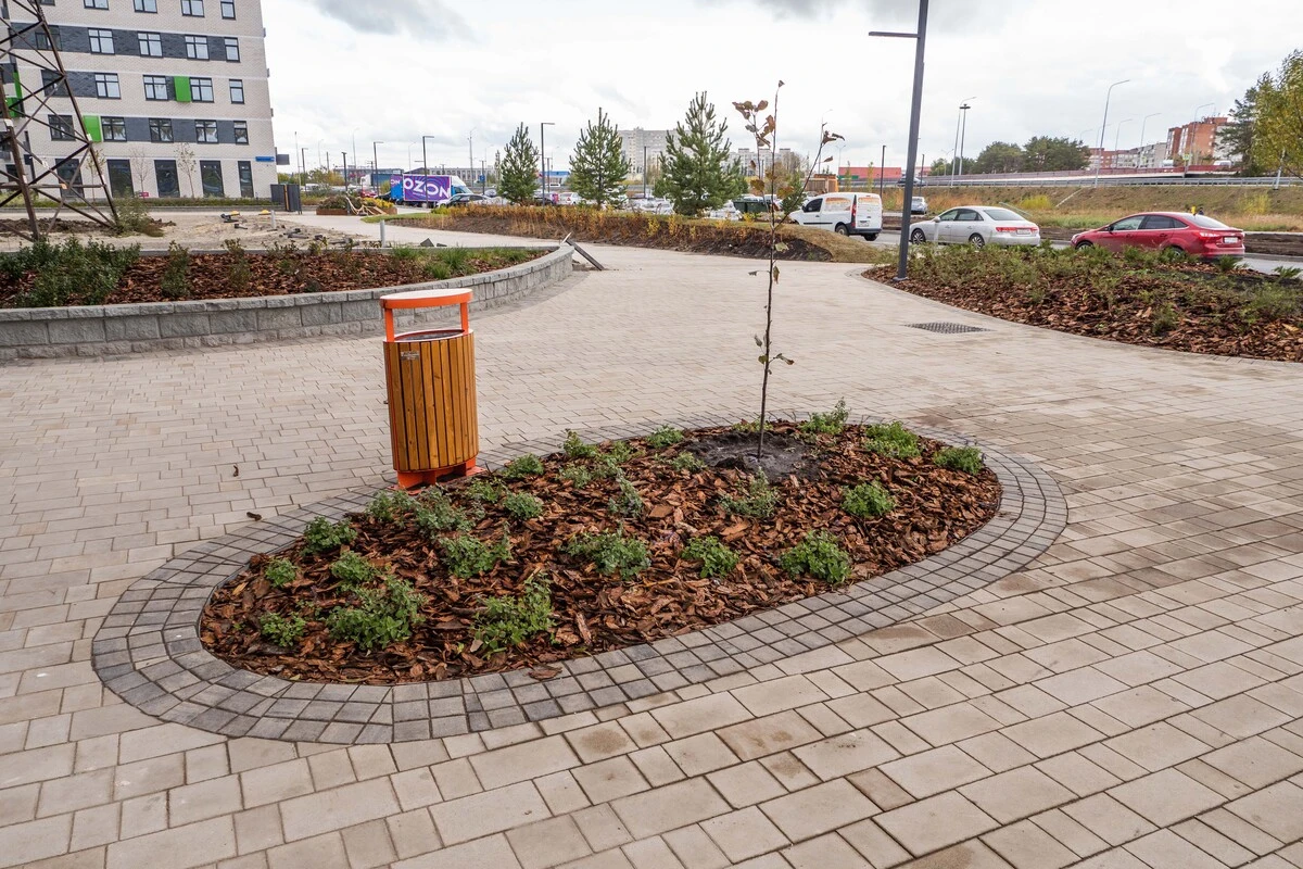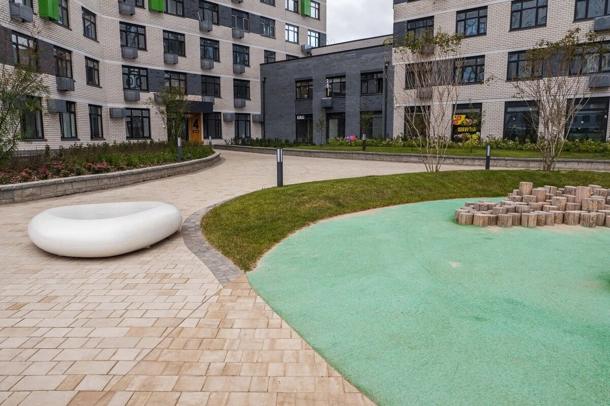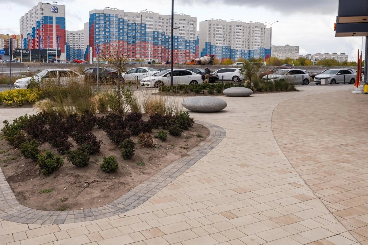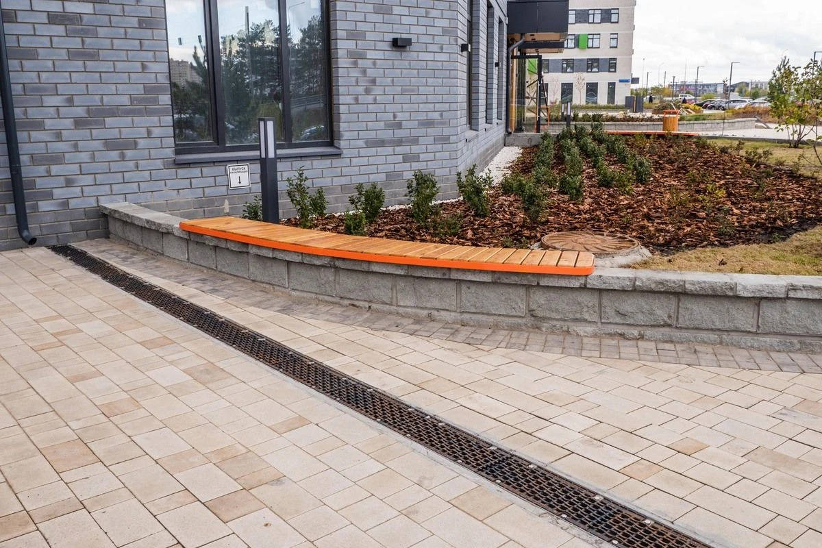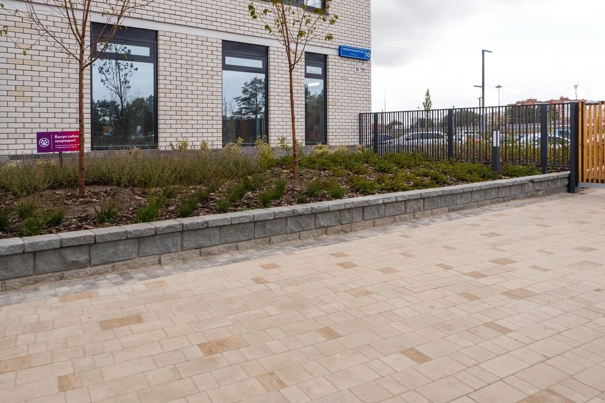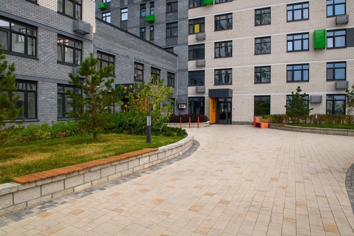 Проект выполнен в ЖК Колумб для внутренней и внешней отделки территории комплекса. Основный материал — тротуарная плитка «Старый город» в цветах Доломит и Степняк, которые визуально отделяют зоны друг от друга, а также служат контрастом от асфальтированной территории.