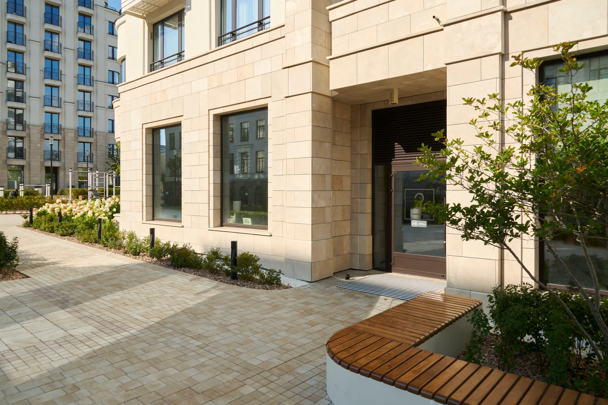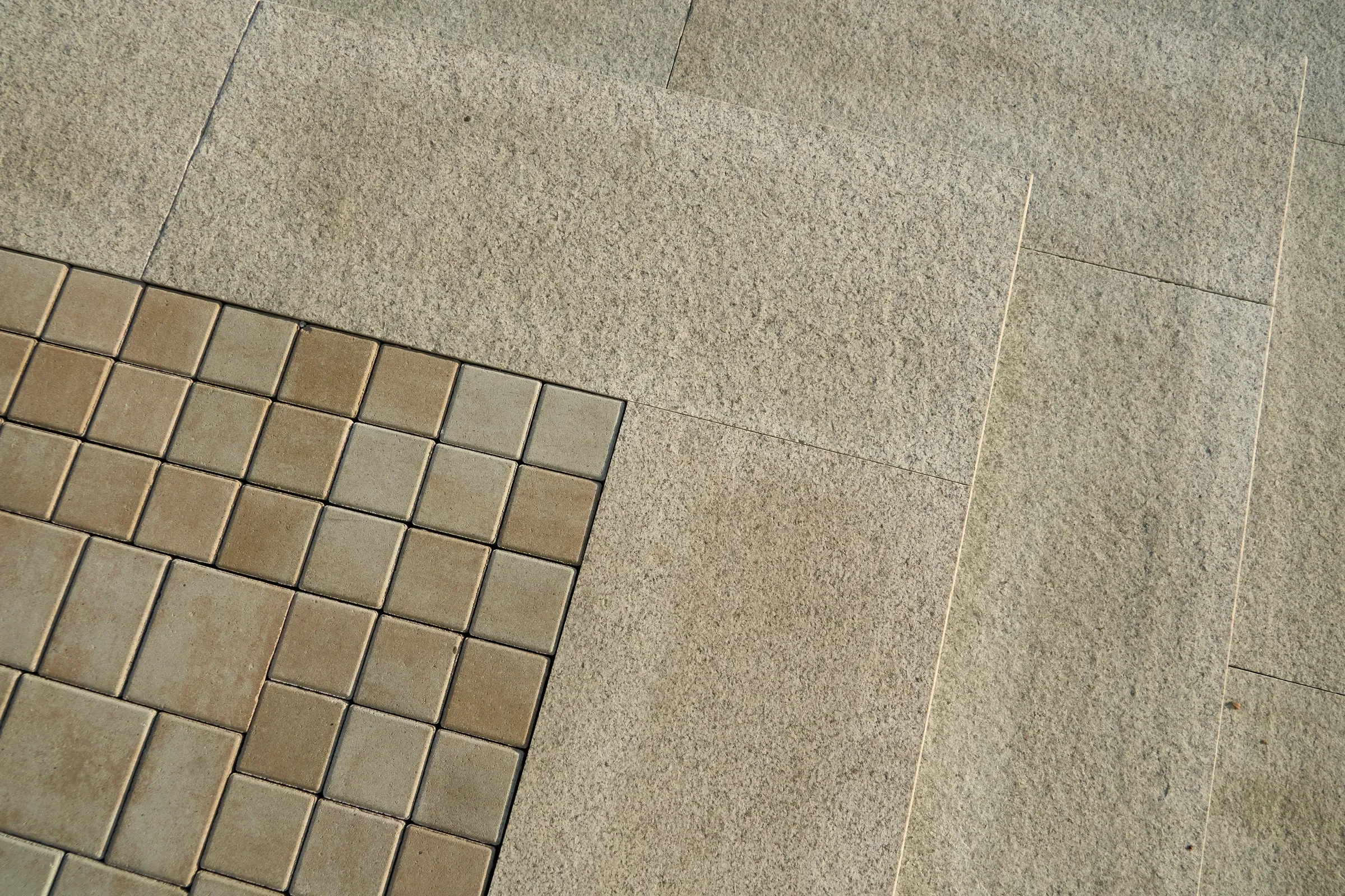Песчаный цвет плиты идеально сочетается с фасадами домов.