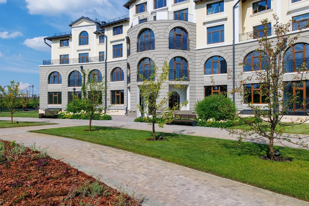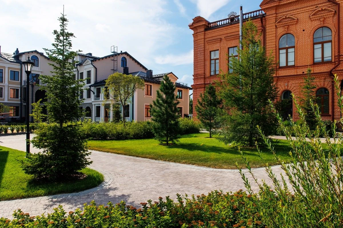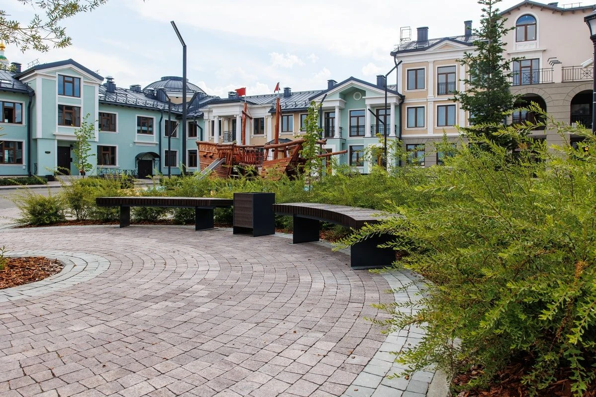 При благоустройстве территории жилого комплекса "Вознесенский" в Тюмени была использована тротуарная плита формы Абрис, в двух коллекциях: гладкий Стандарт и колормикс Гранит цвет Хаски.